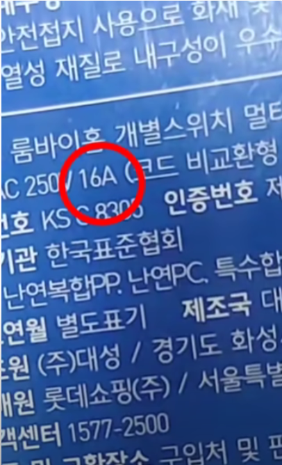 이 부분은 화재와도 관련이 있기 때문에, 화재 예방을 위해서도 무조건 위 제품처럼 정격용량 16A 이상으로 구입하셔야 합니다.